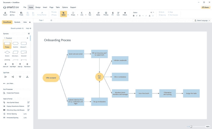 SmartDraw es un software de creación de diagramas que ofrece una amplia gama de plantillas y símbolos para crear diagramas de flujo, organigramas, planos de planta y más. SmartDraw es compatible con los sistemas operativos Windows y Mac, y su interfaz de arrastrar y soltar facilita la creación de diagramas de aspecto profesional de forma rápida y sencilla.