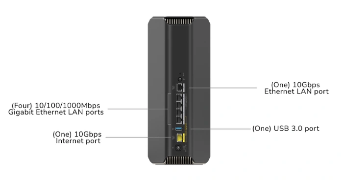 – Más puertos con cable en cada dispositivo: conecte dispositivos con cable para mejorar el rendimiento a través de 10 Gbps y cuatro puertos LAN de 1 Gbps.