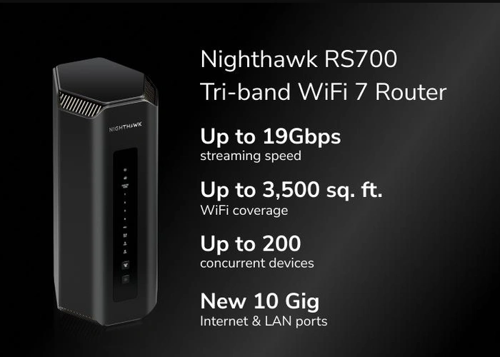 El NETGEAR Nighthawk WiFi 7 Tri-El enrutador de banda RS700S es capaz de cubrir hasta 3500 pies cuadrados e incluye agregación de enlaces para acceso simultáneo a Internet y LAN de varios gigabits, lo que ofrece una transición elegante para que una red doméstica se actualice a una red de varios gigabits. Otras características incluyen: