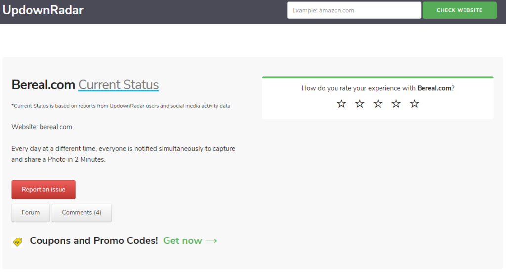 Puede utilizar sitios de terceros como UpDownRadar para comprobar el estado actual de BeReal.