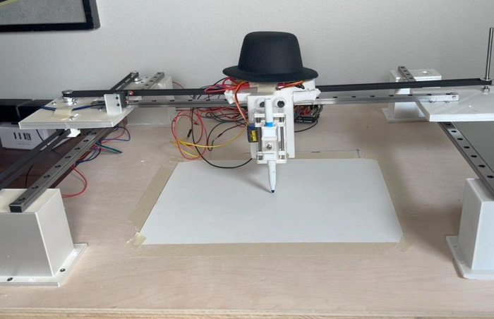 “L’art généré par l’IA fait fureur en ce moment, grâce au partage généralisé sur les réseaux sociaux. L’attrait est évident : n’importe qui peut utiliser un service en ligne pour créer une œuvre d’art unique (et souvent hilarante) basée sur une simple invite. Pour afficher cet art, on peut utiliser une imprimante de haute qualité ou un cadre photo numérique. Ou ils peuvent suivre l’exemple d’Eric Oaks, qui a construit ce traceur à stylo nommé”Drew”qui dessine des œuvres d’art générées par l’IA sur du papier.”