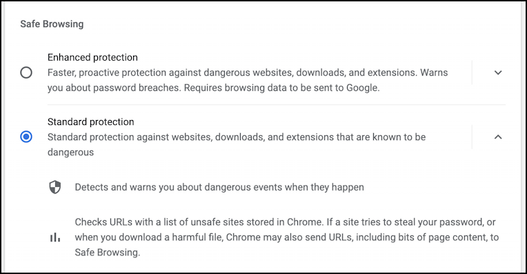 Vous pouvez voir que la valeur par défaut est”Protection standard”qui inclut la protection contre les mauvaises URL connues et les événements potentiellement dangereux (comme une extension qui est sur le point à installer automatiquement), mais est-ce suffisant ? La question tourne en fait autour de savoir si vous voulez vérifier les sites par rapport à une liste statique que vous avez sur votre ordinateur ou si vous êtes d’accord pour que Chrome envoie votre prochaine URL à leur site pour une vérification plus récente. Si vous êtes d’accord pour que Google soit impliqué, activez”Protection renforcée”. Terminé.