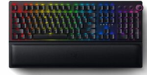 Le design transparent du Razer BlackWidow V3 Pro laisse transparaître l’éclairage brillant du clavier. Bien sûr, vous pouvez modifier la luminosité si vous souhaitez parfois quelque chose de plus sombre. Une autre grande chose est que la technologie de commutation de Razer produit un son de clic satisfaisant et vous permet de taper très précisément. Vous pouvez faire des feuilles de calcul pendant la journée et jouer à des jeux la nuit. Le tout est livré dans un boîtier en métal de”qualité militaire”et donne l’impression qu’il pourrait durer éternellement. C’est l’un des meilleurs claviers RVB que vous puissiez envisager.