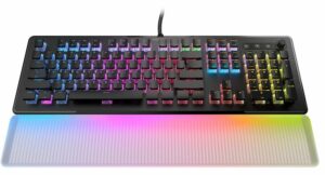 Le Vulcan II Max de Roccat se distingue à la fois par son apparence et par son fonctionnement. Vous obtenez des commutateurs mécaniques optiques Titan II, qui sont très durables et fonctionnent très rapidement, vous donnant un avantage sur vos adversaires. Vous pouvez modifier le fonctionnement des touches, créer vos propres macros et stocker jusqu’à quatre profils sur le clavier. Il existe même une technologie appelée Easy-Shift+ qui permet de changer facilement les fonctions des touches.
