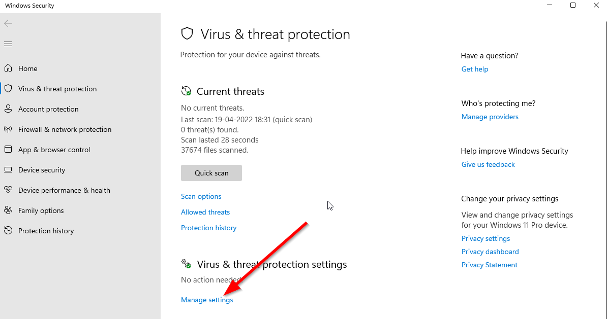 Maintenant , cliquez sur le bouton Ouvrir la sécurité Windows . Accédez à Protection contre les virus et menaces > Cliquez sur Gérer les paramètres.