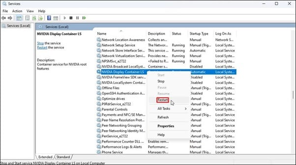 Faire défiler dans la liste des services et recherchez Nvidia display Container LS Service. Une fois que vous l’avez trouvé, faites un clic droit dessus. Sélectionnez Redémarrer dans le menu contextuel pour redémarrer le service.