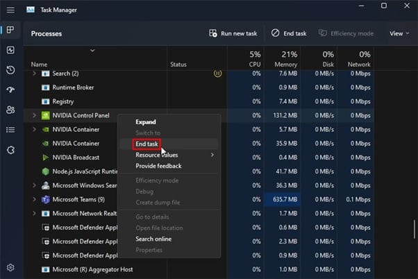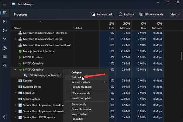 Ouvrez le Gestionnaire des tâches et recherchez l’affichage NVIDIA processus de conteneur. Cliquez avec le bouton droit dessus et sélectionnez l’option Fin de tâche.