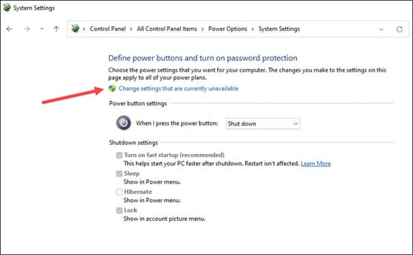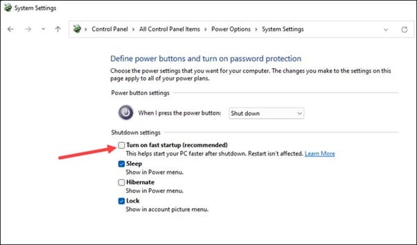 Maintenant, décochez la case pour l’option Activer le démarrage rapide (recommandé).