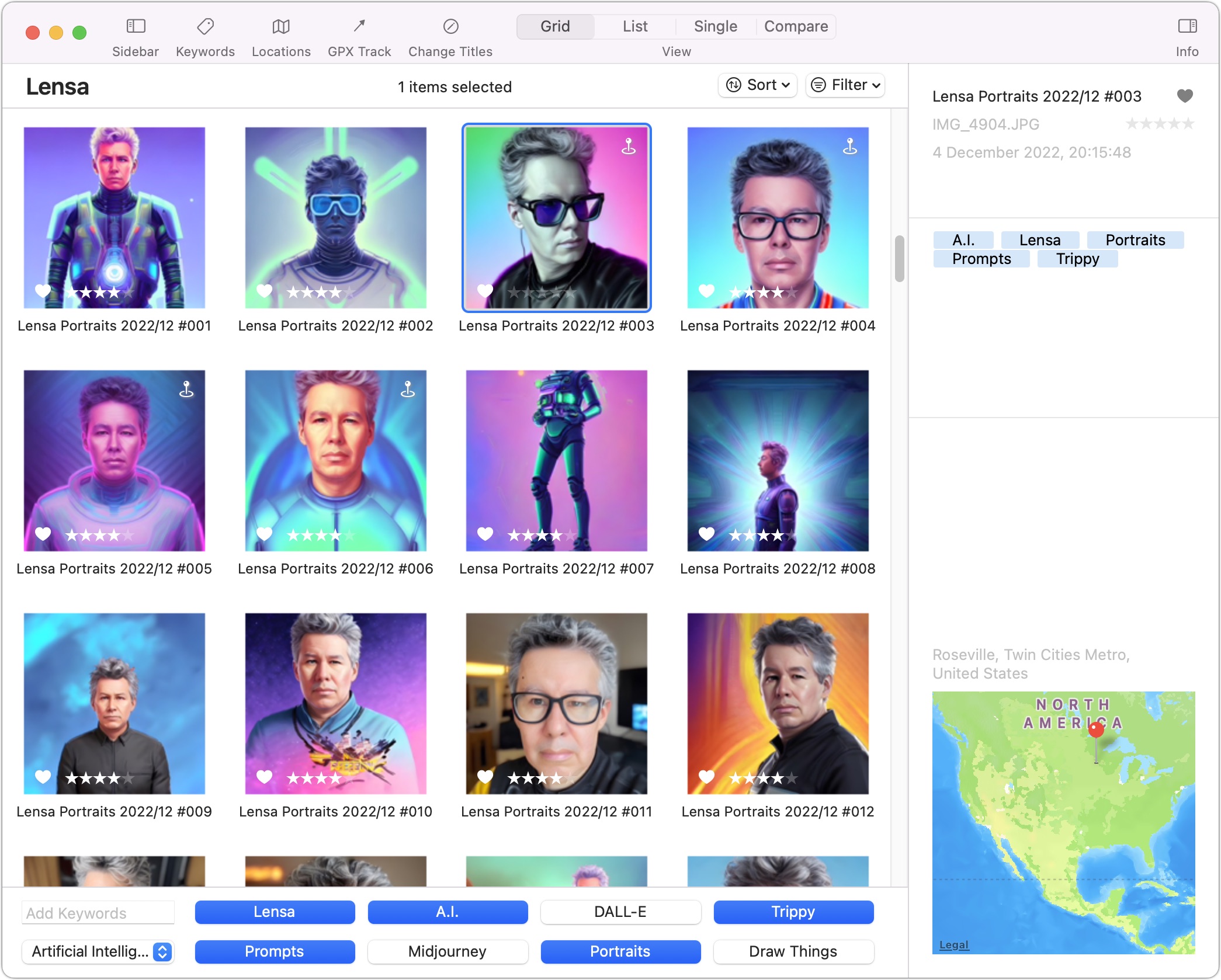 La barre d’outils de Photos Workbench pointe vers les principales fonctionnalités de l’application, avec des boutons pour les mots-clés, les emplacements, la piste GPX et la modification des titres. Vous pouvez afficher vos photos dans quatre modes, accessibles par des boutons de barre d’outils supplémentaires : Grille, Liste, Unique et Comparer. Hélas, vous ne pouvez pas modifier la vignette ou la taille de l’image.