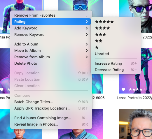 Vous pouvez définir des notes par étoiles directement dans Photos Workbench en utilisant les commandes du menu Image > Note (ou, plus probablement, leurs raccourcis clavier). Vous pouvez également cliquer sur les photos sélectionnées tout en maintenant la touche Contrôle enfoncée. Pour une photo individuelle, il peut être plus facile de cliquer sur les étoiles au bas de la vignette.