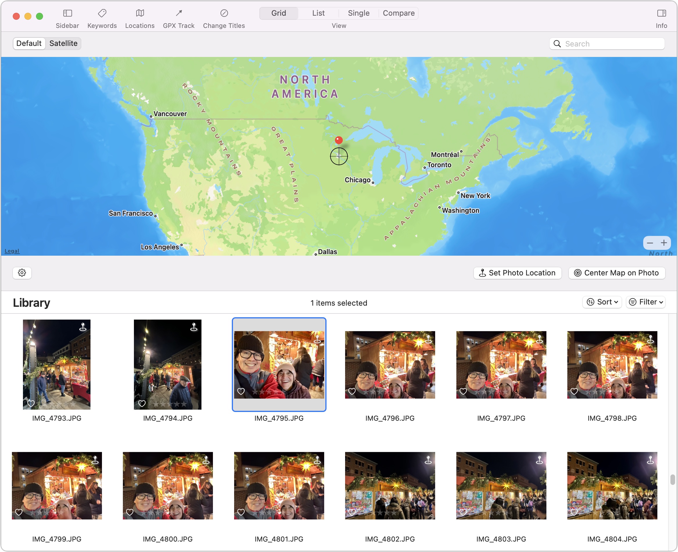 Dans mon cas, c’était un exercice inutile car mes photos contenaient déjà des données de localisation, donc je pouvais voir une carte avec des épingles simplement en sélectionnant les photos. Mais GPX Track serait extrêmement bienvenu lorsque les données de localisation ou d’heure sont manquantes (parce que le téléphone n’a pas été configuré pour enregistrer les informations de localisation, par exemple, ou vous avez utilisé un appareil photo sans capacités GPS) ou incorrectes (si l’horloge de l’appareil photo est réglée sur un autre fuseau horaire, ou simplement parce que l’horloge de l’appareil photo est un peu décalée). Si le géocodage de votre sortie ne semble pas correct, GPX Track l’écrasera avec les nouvelles données. Vous ne pouvez pas annuler cela, alors soyez prudent.