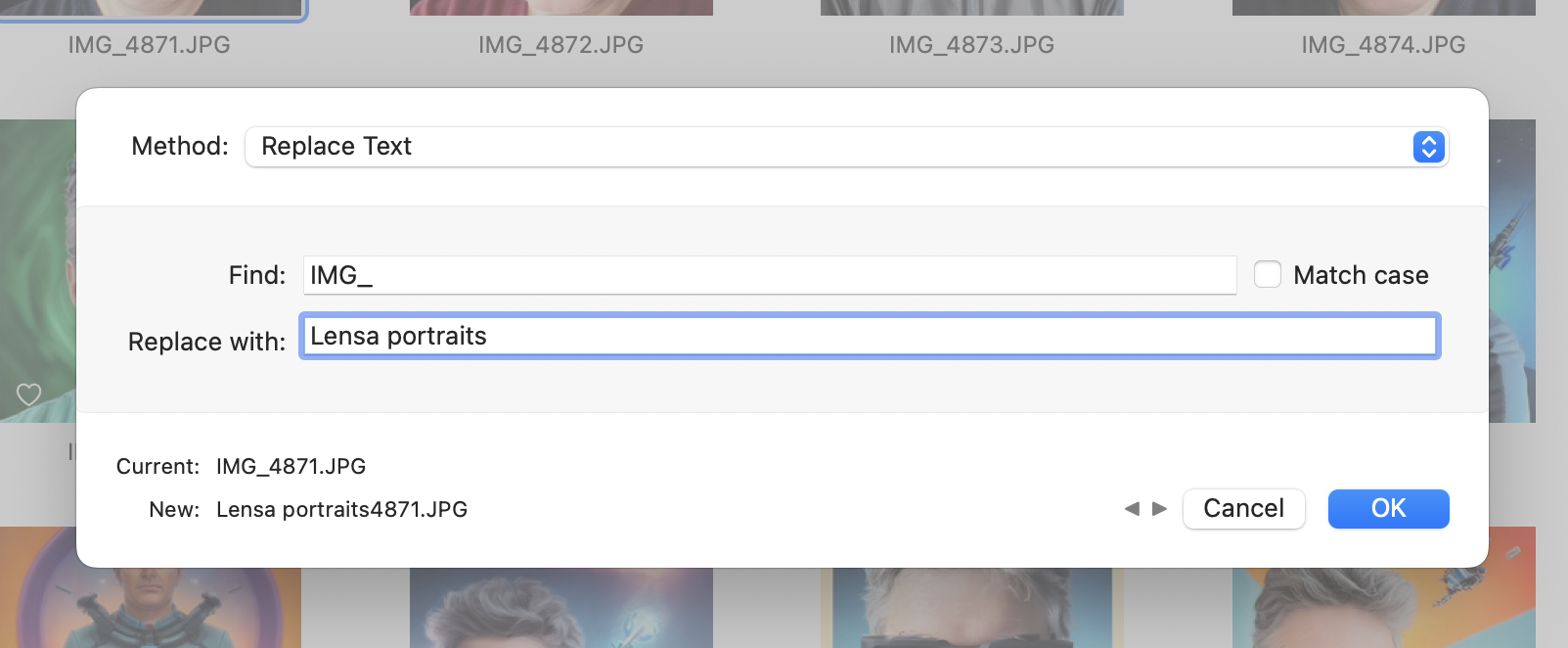 Photos Workbench gère le renommage par lots des titres dans un deux façons, toutes deux initiées en cliquant sur Changer les titres dans la barre d’outils. La fenêtre Modifier les titres intègre un outil de remplacement de texte qui, par exemple, vous permet de remplacer le préfixe IMG_ courant par un ou plusieurs mots plus mémorables, comme je l’ai fait ci-dessous.