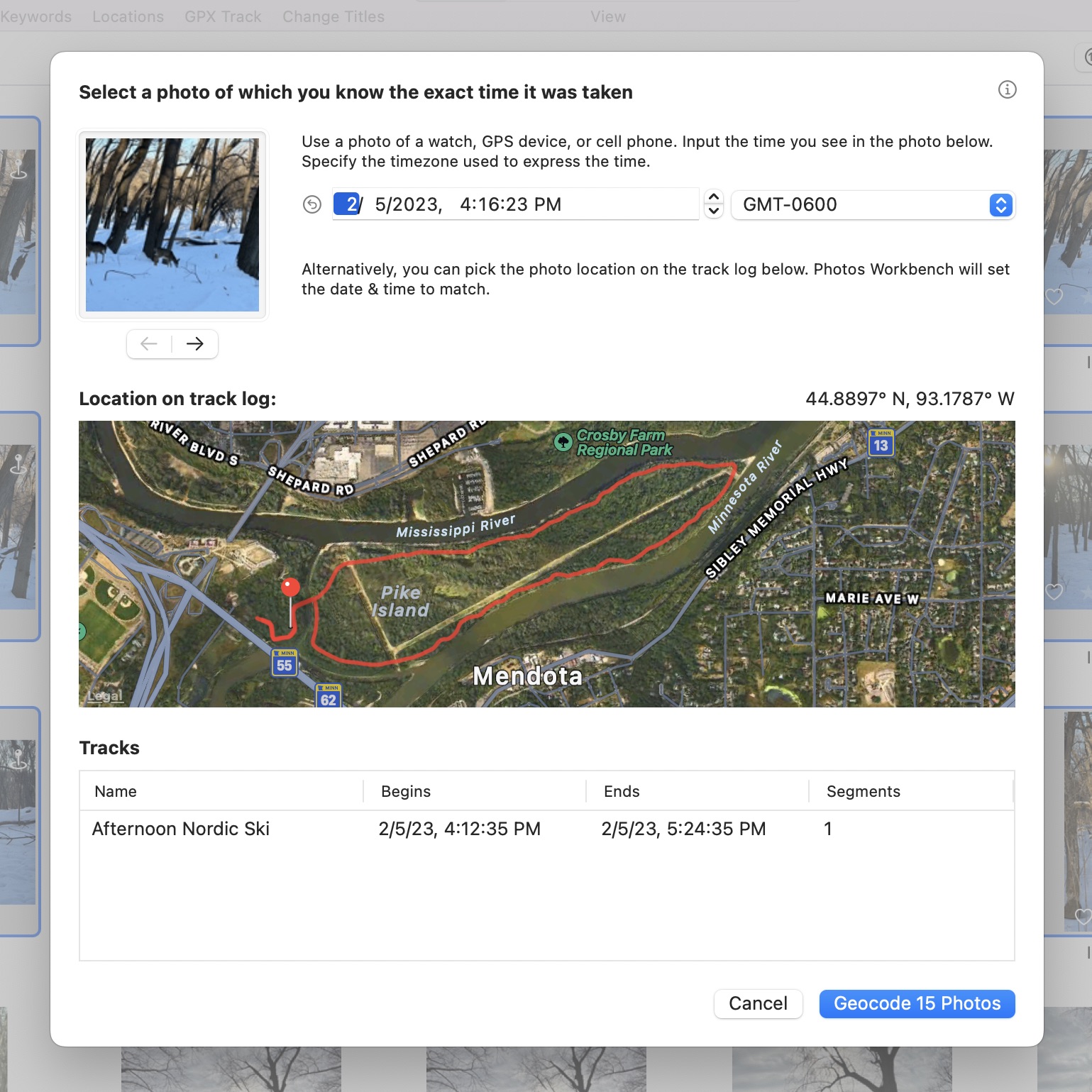 Photos Workbench utilise ces données pour attribuer des emplacements aux photos prises le long de l’itinéraire enregistré par GPS. Par exemple, j’ai récemment enfilé mes skis de fond pour faire le tour de Pike Island, qui fait partie d’un parc d’État du Minnesota près de chez moi à St. Paul et où les rivières Minnesota et Mississippi se rencontrent. J’ai pris des photos du cerf apprivoisé et des vues magnifiques le long du chemin pendant que Strava enregistrait invisiblement mon chemin.
