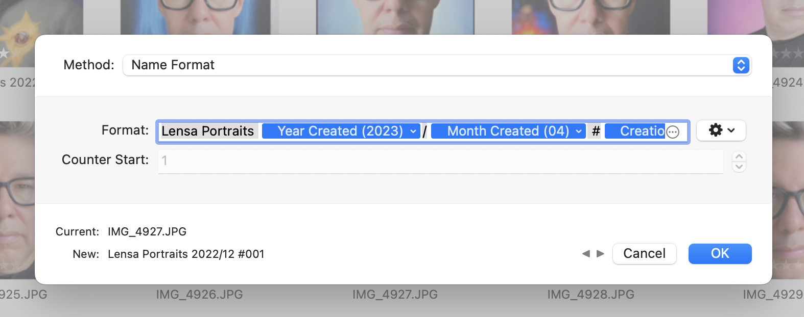 Vous pouvez modifier certains jetons de titre (leurs bulles ont petits menus déroulants faciles à manquer). Par exemple, vous pouvez basculer entre les années à deux ou quatre chiffres et les mois à l’aide de chiffres ou de noms, comme dans”Lensa Portraits 23/Février #001″.