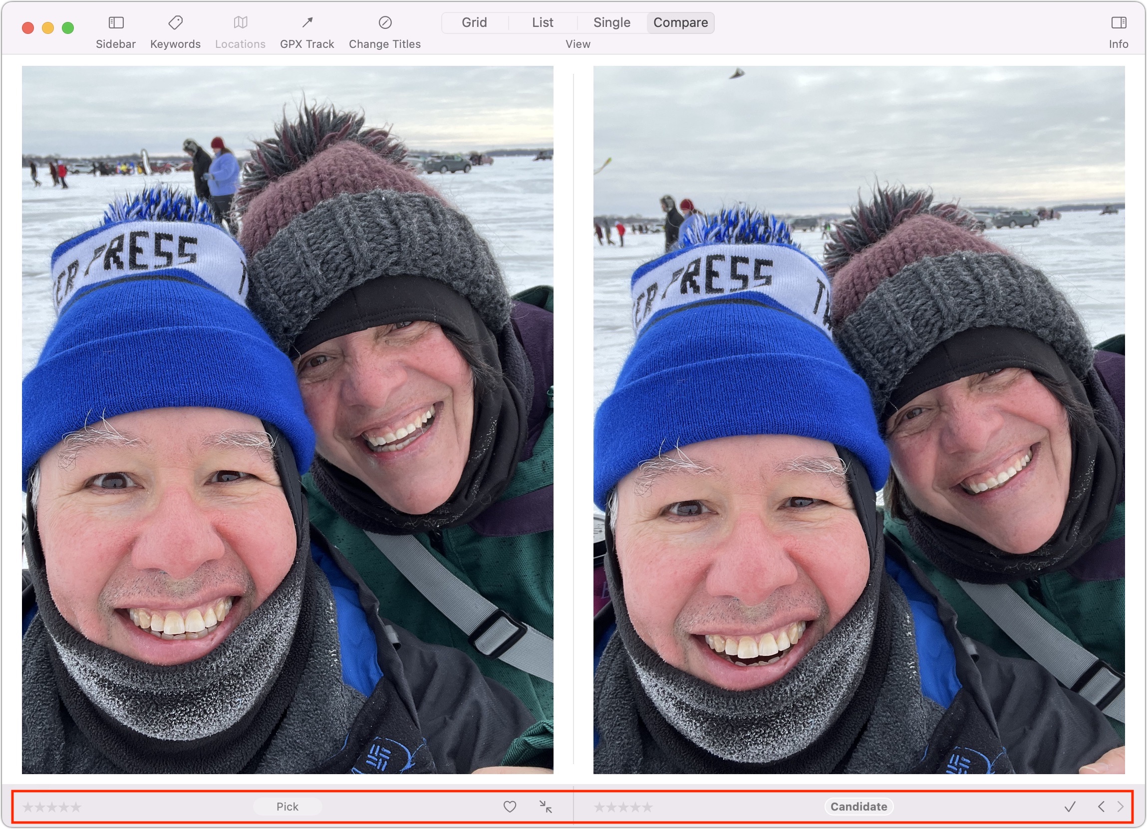 Pour entrer en mode Comparer, sélectionnez les images que vous souhaitez comparer et cliquez sur Comparer dans la barre d’outils. La visionneuse principale affiche deux photos côte à côte. La photo de gauche est désignée comme le Pick, le meilleur vu jusqu’à présent. À droite se trouve le candidat, la photo que vous souhaitez évaluer par rapport au choix.