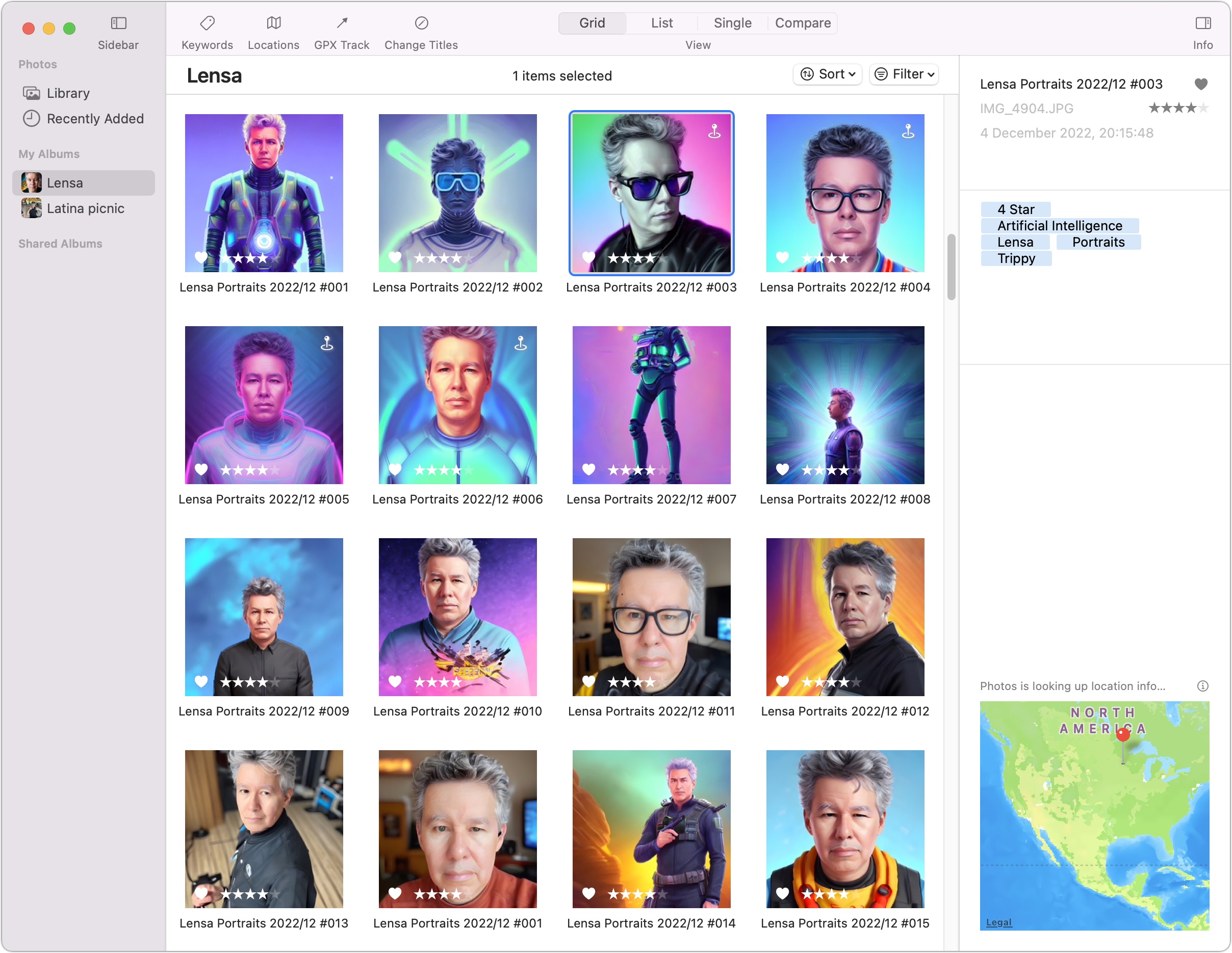 À première vue , vous pourriez confondre Photos Workbench avec Photos. Une grille de photos familière se trouve à l’avant et au centre au milieu, et une barre latérale gauche permet d’accéder à votre bibliothèque, aux photos récemment ajoutées, aux albums, aux albums intelligents et aux albums partagés. Les informations de l’image sélectionnée apparaissent dans un panneau sur la droite, un peu comme la petite fenêtre flottante qui apparaît lorsque vous choisissez Fenêtre > Infos dans Photos. Les menus contextuels Trier et Filtrer vous permettent de contrôler la façon dont les images apparaissent dans la grille de photos.