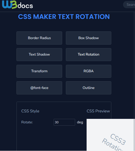 w3docs.com est un site Web de générateur de code de rotation de texte CSS en ligne gratuit. À l’aide de ce site Web, les utilisateurs peuvent faire pivoter les éléments 2D et 3D en fonction de leurs besoins, puis générer un code de rotation CSS pour les éléments. Il fournit également un exemple de texte que les utilisateurs peuvent faire pivoter et prévisualiser. Pour effectuer la rotation, il propose un outil de rotation qui nécessite des valeurs en degré pour ajuster la rotation de l’élément. En plus de cela, il propose également des outils pour ajuster le rayon de la bordure de l’élément, l’ombre du texte, l’ombre de la boîte, etc. Maintenant, suivez les étapes ci-dessous.