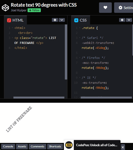 codepen.io est un autre site Web de rotation de texte CSS en ligne gratuit. Il s’agit principalement d’un site Web de développement et de test de code frontal qui propose également un générateur de code de rotation de texte CSS. Contrairement à d’autres sites Web similaires, il permet aux utilisateurs de générer des codes optimisés pour différents navigateurs Web tels que Safari, Mozilla Firefox, Opera, Internet Explorer, etc. En accédant à sa section CSS, les utilisateurs peuvent spécifier l’angle de rotation du texte pour un navigateur spécifique. Selon l’angle spécifié, un exemple de texte sera affiché sur son interface. Après cela, les utilisateurs peuvent facilement copier le code de rotation du texte CSS à partir de son interface. Maintenant, suivez les étapes ci-dessous.