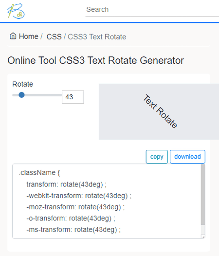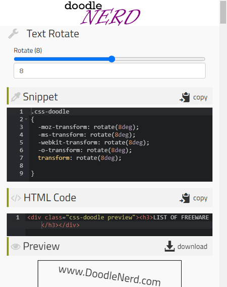 Visitez ce site Web en utilisant le lien fourni. Après cela, utilisez le curseur pour spécifier l’angle de rotation. Maintenant, prévisualisez la rotation spécifiée sur un exemple de texte dans sa fenêtre de prévisualisation. Ensuite, téléchargez le code au format de fichier CSS en cliquant sur le bouton Télécharger.