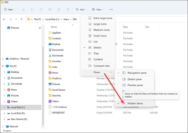 Si vous ne voyez pas le dossier AppData ici, cliquez sur Afficher, sélectionnez Afficher et cochez les éléments masqués.