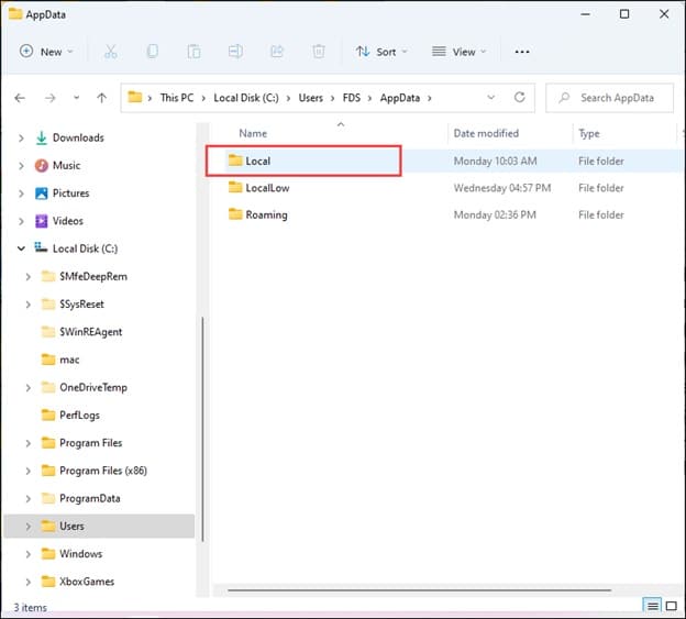 Ouvrir le dossier et ouvrez ensuite le dossier local.