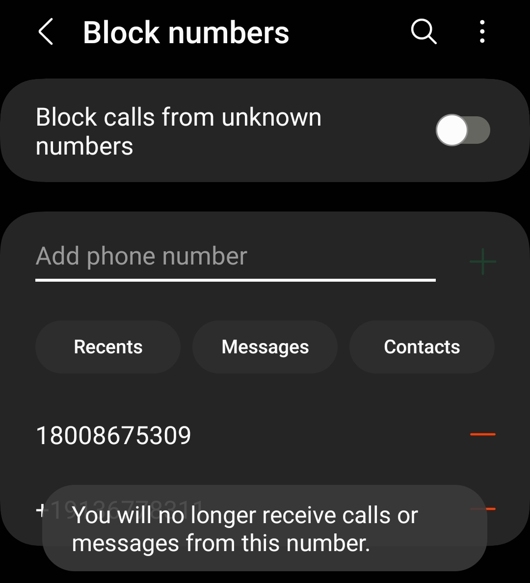 Vous pouvez désormais ajouter n’importe quel numéro de téléphone que vous souhaitez à votre liste de blocage. Tapez un numéro pour le bloquer et sélectionnez le symbole plus pour l’ajouter à la liste de blocage. Alternativement, vous pouvez récupérer les numéros des appels et SMS récents ici. Vous pouvez également configurer votre téléphone pour bloquer les appels provenant de”numéros inconnus”.