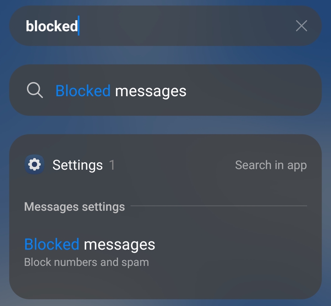 Ouvrez le menu de recherche sur votre smartphone et tapez “Bloqué”. Dans les résultats, sélectionnez la section qui indique Messages bloqués pour accéder à une liste de numéros que vous avez bloqués sur votre téléphone. Choisissez Bloquer les numéros, et vous êtes pris vers un menu familier où vous pouvez bloquer un numéro avec Android.