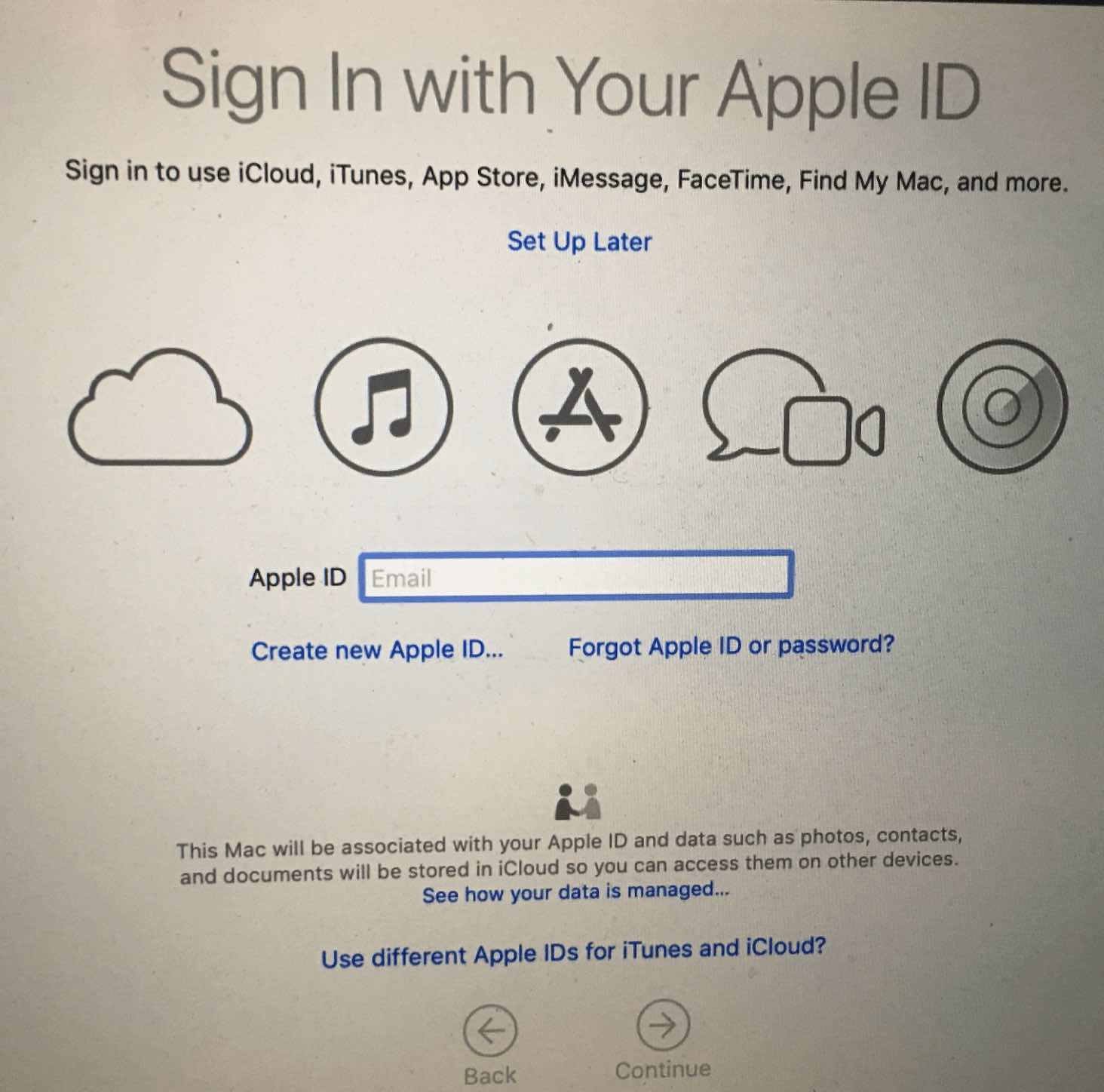 Vous êtes sur l’écran des conditions générales et vous ne pouvez pas passer à l’étape suivante car le bouton Accepter ne fonctionne pas. Bien que vous ne puissiez pas avancer, ce que vous pouvez faire, c’est reculer. Cliquez sur le bouton Retour. Revenez à l’étape où vous vous connectez au compte iCloud/Apple ID. Vous verrez un écran indiquant”Connectez-vous avec votre identifiant Apple”. Maintenant, ne vous connectez pas à votre compte Apple ID. Sélectionnez l’option pour le faire plus tard. Vous verrez un bouton indiquant”Ignorer cette étape”ou”Configurer plus tard“. Cliquez dessus, comme vous pouvez le voir dans l’image ci-dessous. Ne t’inquiète pas; vous pourrez vous connecter une fois la configuration terminée. Passez maintenant à l’écran Termes et conditions. Vous pourrez maintenant cliquer sur le bouton Accepter et passer à l’étape suivante. Ensuite, vous pouvez terminer le processus d’installation.