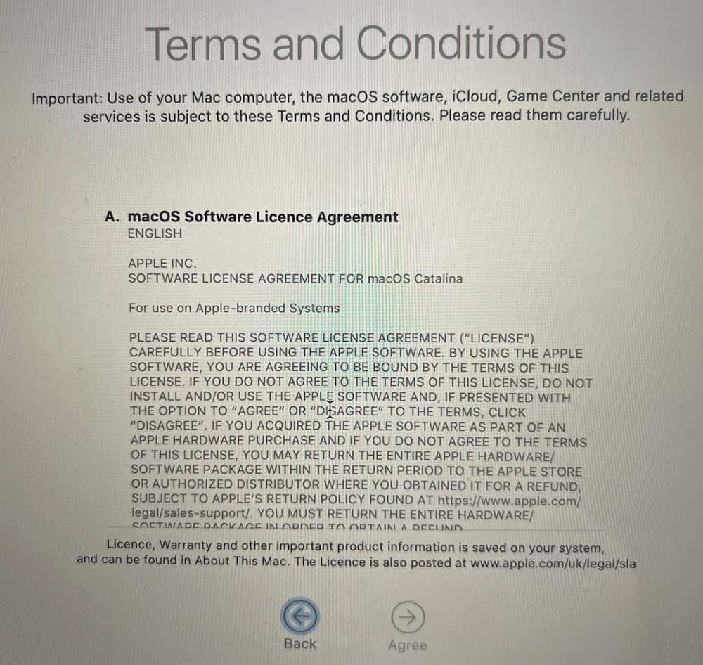 Comme vous pouvez le voir ci-dessous, le bouton Accepter ne fonctionne pas. L’étape des termes et conditions est un contrat juridiquement contraignant axé sur les règles d’Apple et vos droits. Le processus de configuration doit être terminé après la réinstallation ou la réinitialisation de macOS ou avant d’utiliser un nouveau Mac.