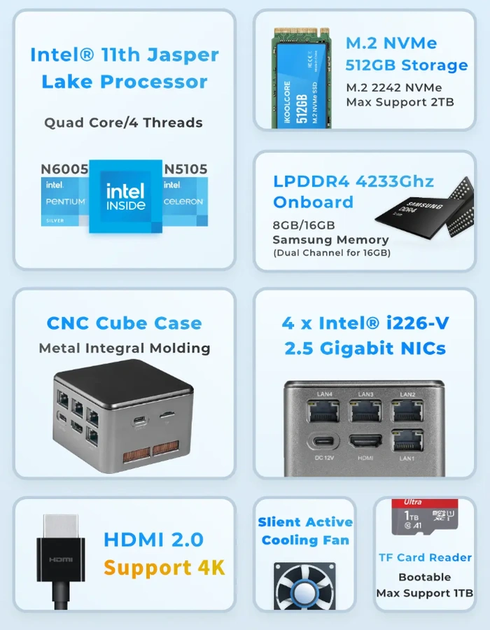 Pris en charge par LPDDR4-4233 monocanal 8 Go ou double canal 16 Go qui n’est malheureusement pas évolutif. Les autres caractéristiques comprennent 4 ports Ethernet 2,5 GbE (Intel i226-V) ainsi qu’un stockage intégré sous la forme d’un SSD M.2 2242 PCIe 3.0 NVMe dans des capacités de 128 Go ou 512 Go. Les ports du cube mini PC incluent HDMI 2.0 (4K/60Hz), USB 3.1 Type-C (10 Gbps), 2 x USB 3.0 Type-A, un lecteur de carte microSD pratique et un USB-C pour l’alimentation uniquement.