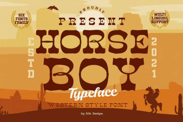 Horse Boy Typeface propose un ensemble de 6 polices attrayantes inspirées des styles Cowboy et occidental. Ces polices peuvent être utilisées pour les tatouages, les affiches, les salons de coiffure, les emballages de boissons alcoolisées et à d’autres fins. Étant donné que toutes les variantes et tous les glyphes de cette police sont encodés en PUA, elle est facile à utiliser avec des projets de conception et non-conception.