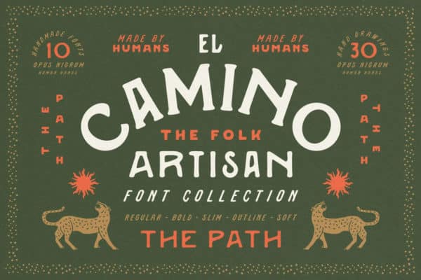 Elle prend en charge plusieurs langues et comprend des conceptions prédéfinies pour Adobe Illustrator. Le fichier de police comprend El Camino Regular, El Camino Texture, El Camino Outline, El Camino Soft Edges, El Camino Caps, El Camino Caps Texture, El Camino Caps Outline, El Camino Caps Soft Edges, El Camino Bold, El Camino Slim et Dessins El Camino aux formats OTF, TTF et WOFF.