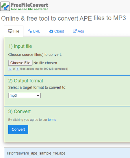 Come convertire APE in MP3 online utilizzando freefileconvert.com: