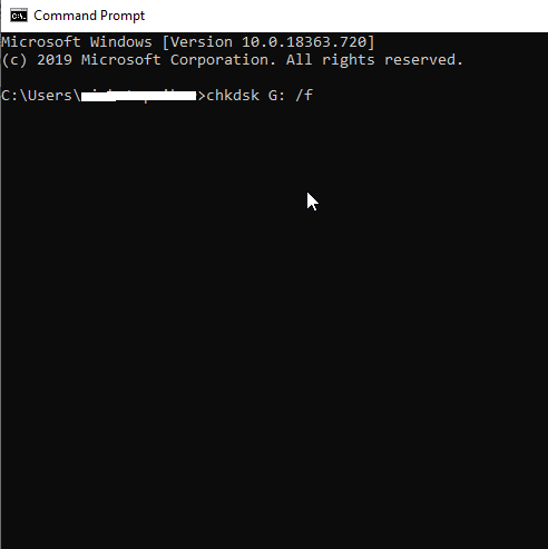 Ora digita chkdsk G:/f e premi il tasto Invio. Qui G, è la lettera dell’unità assegnata all’unità flash.