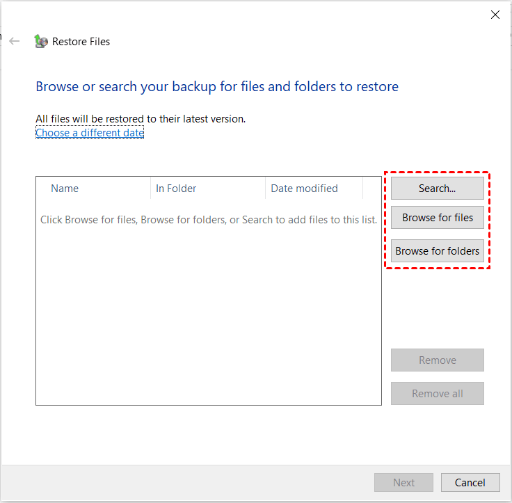 Successivamente, fai clic su Cerca, Sfoglia per file o Sfoglia per cartelle per cercare i file che desideri ripristinare.