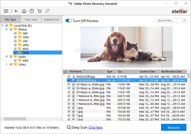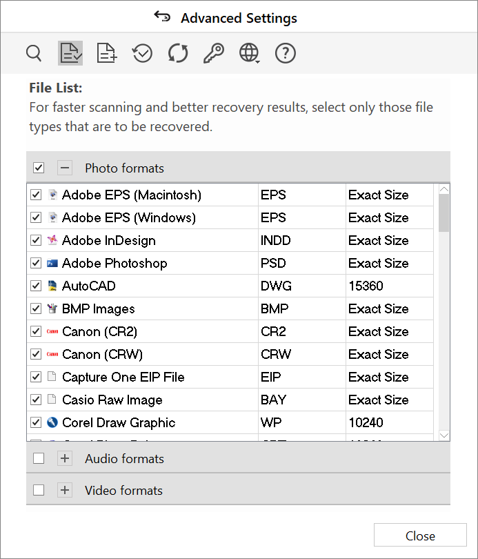 Avanti , vai a Impostazioni, fai clic su File Elenco, quindi seleziona la casella accanto a Foto Formati e deseleziona gli altri se desideri recuperare solo le foto. Fai clic su Chiudi.