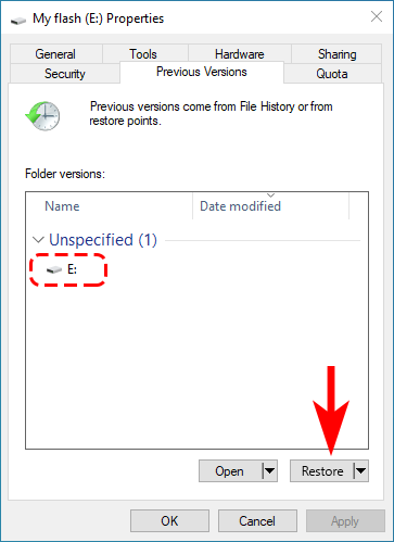 Collega l’unità flash al computer. Fai clic con il pulsante destro del mouse sulla cartella da cui sono state perse le tue foto in USB e seleziona Proprietà. Vai alla scheda Versione precedente. Nella sezione Versioni file, puoi visualizzare l’elenco delle opzioni di ripristino disponibili con data e ora. Scegli la versione del file che desideri ripristinare e fai clic su Ripristina per recuperare i file dell’unità USB.