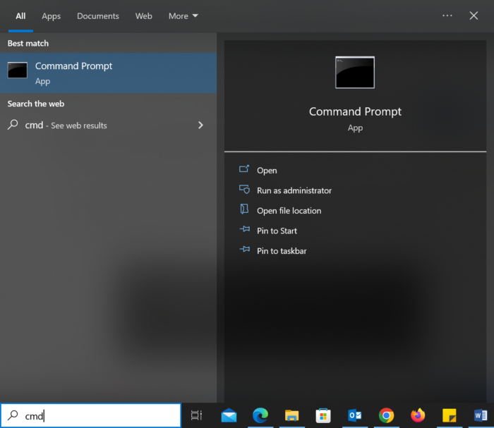 collega la tua unità flash al sistema. Nella barra di ricerca, digita cmd e premi Apri per avviarlo.