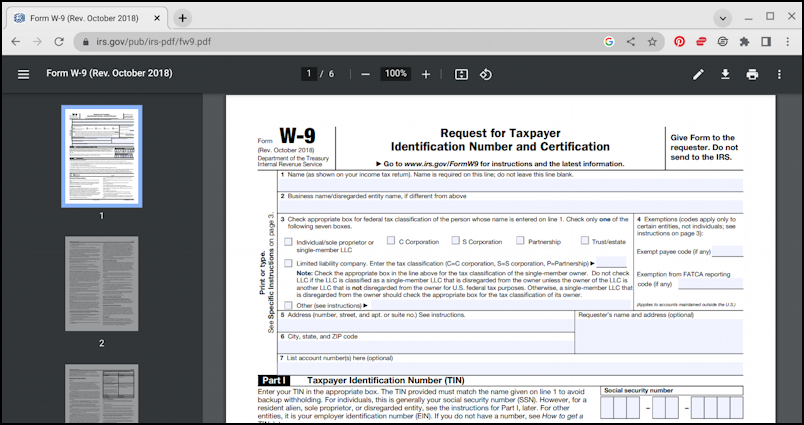 A scopo dimostrativo, prendo un modulo PDF che molte, molte persone compilano: il W-9 modulo dell’Internal Revenue Service. Vuoi giocare a casa? Prendi una copia: W9.PDF. L’apertura di quel link in Chrome lo mostra nel visualizzatore: