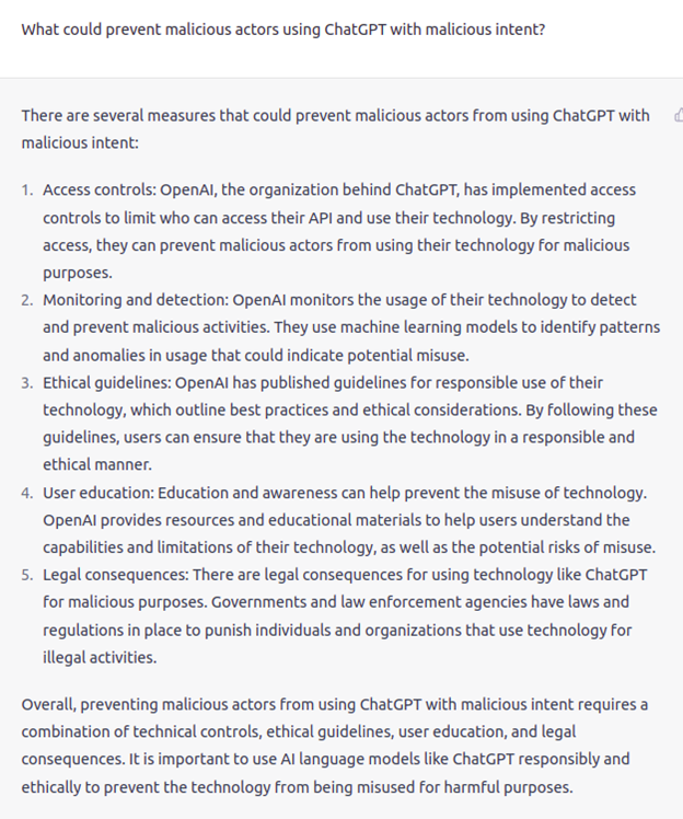 Con l’ultima release di ChatGPT (ChatGPT-4), OpenAI ha reso disponibile l’ultimo e più potente modello conversazionale, introducendo anche maggiori controlli per prevenirne l’uso improprio. Abbiamo chiesto a ChatGPT”Cosa potrebbe impedire agli attori malintenzionati di utilizzare ChatGPT con intenti dannosi”e questa è stata la risposta: