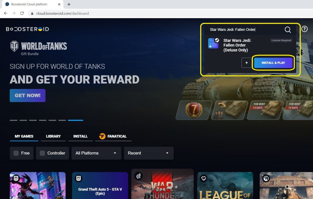 3. Successivamente, utilizza la funzione di ricerca per individuare Star Wars Jedi: Fallen Order e seleziona”Installa e gioca”per avviare il gioco. Ti verrà richiesto di accedere al tuo account Steam una volta che Boosteroid carica il gioco per iniziare a giocare.