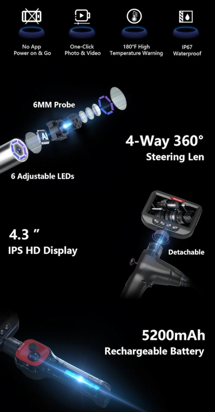 “Ralcam F6 NUOVE batterie ai polimeri di litio ad alta capacità integrate, che supportano fino a 6 ore di utilizzo. Supporta la registrazione di immagini JPEG e Video MPEG-4 con audio. È molto adatto per la manutenzione di macchinari, il monitoraggio della sicurezza, la manutenzione dei veicoli, l’ispezione di centrali elettriche, l’industria di tubazioni chimiche, l’ispezione di turbine a gas per caldaie e aerospaziale. Se sei un proprietario di casa, un elettricista, un meccanico, in particolare per gli idraulici regali agli uomini che amano la tecnologia.”