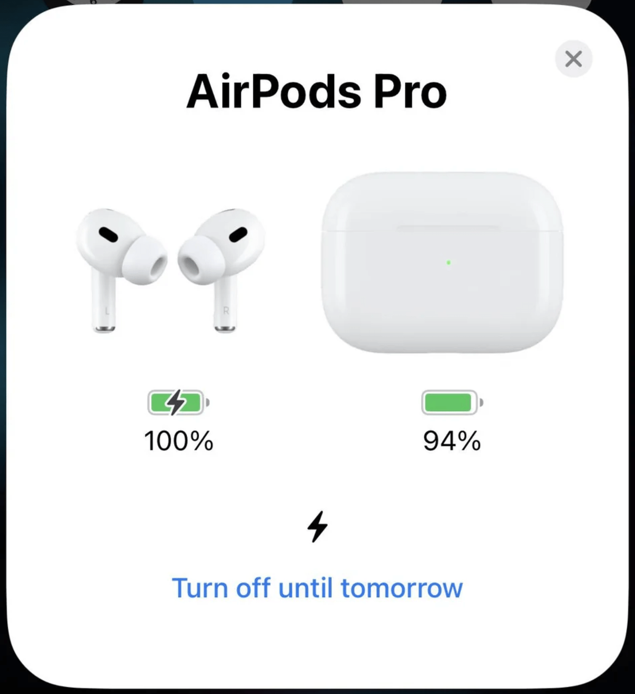 Potresti aver visto apparire questo messaggio sul tuo iPhone. Quando il tuo telefono si connette ai tuoi AirPods, ricevi un popup che mostra i tuoi AirPods e la loro custodia, i livelli della batteria e un messaggio:”Spegni fino a domani”. Potresti pensare:”Spegni cosa, esattamente?”