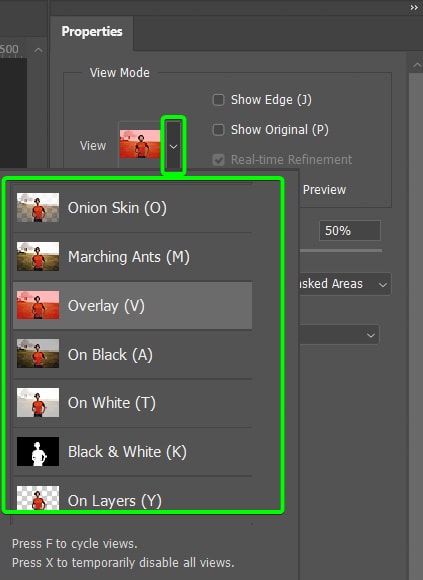 Per prima cosa, decidi come vuoi che appaia l’anteprima al centro. Puoi scegliere di avere una versione in bianco e nero dell’immagine, una vista a buccia di cipolla o una sovrapposizione rossa sulle aree non selezionate.