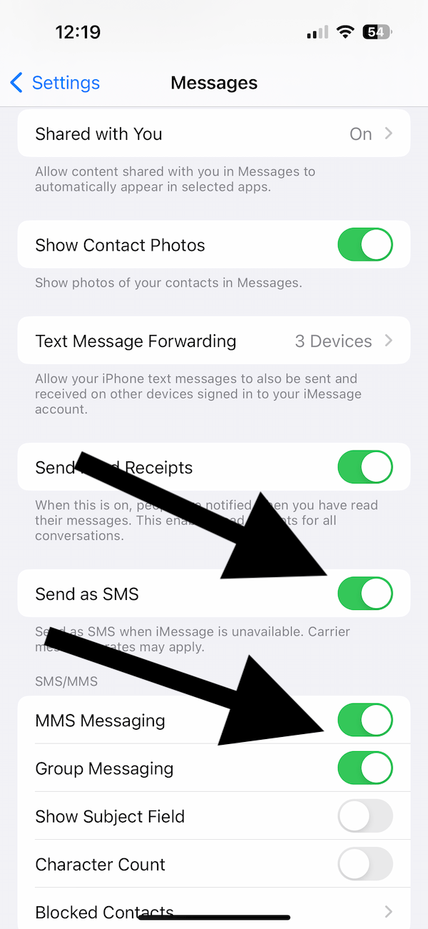 I messaggi Android vengono inviati tramite gli operatori come SMS o MMS. Pertanto, se desideri inviare o ricevere messaggi SMS o MMS, devono essere abilitati sul tuo iPhone. Assicurati che siano abilitati sul tuo iPhone andando su Impostazioni > Messaggi. Assicurati che Invia come SMS, Messaggi MMS e Messaggi di gruppo siano attivati. Se sono già abilitati, spegnili e riaccendili.