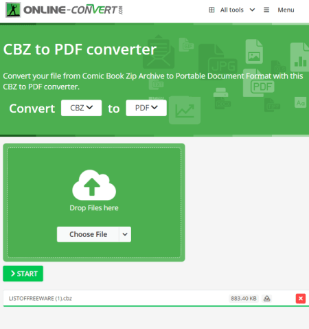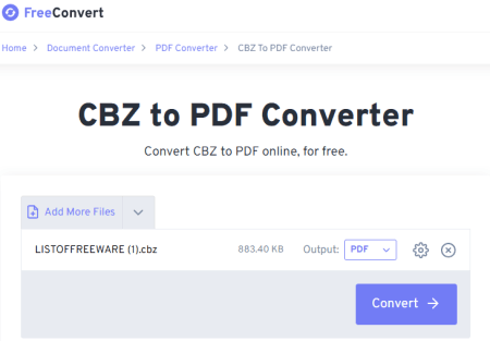FreeConverting.com เป็นอีกหนึ่งเว็บไซต์ฟรีที่ให้คุณแปลง CBZ เป็น PDF ออนไลน์ ตัวแปลงนี้มีส่วนต่อประสานขั้นต่ำที่คุณสามารถเพิ่มไฟล์จำนวนเท่าใดก็ได้ หลังจากนั้น คุณสามารถเริ่มการแปลง ตัวแปลงนี้จะแปลงไฟล์ตามลำดับที่ต่อเนื่องกัน ทันทีที่มีการแปลงไฟล์ คุณสามารถดาวน์โหลดไฟล์ที่แปลงแล้วได้ ด้วยวิธีนี้ คุณสามารถดาวน์โหลดไฟล์ที่แปลงแล้วทั้งหมดทีละไฟล์