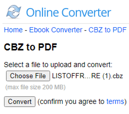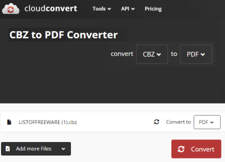 ไปที่เว็บไซต์ CloudConvert; ลิงก์โดยตรงระบุไว้ด้านล่าง คลิกที่ปุ่ม เลือกไฟล์ และเพิ่มไฟล์ CBZ ของคุณที่นั่นโดยใช้วิธีการป้อนข้อมูลที่ต้องการ ในหน้าจอถัดไป ให้เลือก PDF เป็นรูปแบบเอาต์พุตจากดร็อปดาวน์ จากนั้นคลิกที่ปุ่มแปลงเพื่อเริ่มการแปลง รอให้การแปลงเสร็จสิ้น จากนั้นดาวน์โหลดไฟล์ที่แปลงแล้ว
