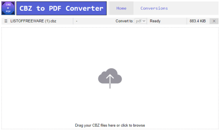 FreeFileConvert เป็นเว็บไซต์ฟรีที่มี โปรแกรมแปลง CBZ เป็น PDF ออนไลน์ ตัวแปลงนี้มีอินเทอร์เฟซแบบหลายแท็บที่สร้างขึ้นจากวิธีการป้อนข้อมูล มีสามแท็บที่ด้านบนเพื่อเพิ่มไฟล์ ซึ่งรวมถึงการอัปโหลดในเครื่อง การนำเข้า URL และการนำเข้าระบบคลาวด์จาก Google Drive หรือ Dropbox คุณสามารถเลือกแท็บและอัปโหลดไฟล์ CBZ ไปยังตัวแปลง โปรดทราบว่า คุณสามารถเพิ่มไฟล์ได้สูงสุด 5 ไฟล์โดยมีขนาดรวมกันสูงสุดไม่เกิน 300 MB ไม่มีตัวเลือกการแปลงที่นี่ คุณสามารถดำเนินการแปลงและรับผลลัพธ์ได้ หน้าจอผลลัพธ์มีสองตัวเลือกในการรับไฟล์ที่แปลงแล้ว คุณจะได้รับปุ่มดาวน์โหลดข้างแต่ละไฟล์ที่คุณสามารถใช้เพื่อบันทึกแต่ละไฟล์ได้โดยตรงทีละไฟล์ คุณยังสามารถใช้ตัวเลือกอีเมลเพื่อเพิ่มที่อยู่อีเมลและส่งลิงก์ดาวน์โหลดทางอีเมล โปรดทราบว่าไฟล์มีให้สำหรับ 24 ชั่วโมงหรือจนกว่าจะดาวน์โหลด 5 ครั้ง หลังจากนั้น ไฟล์จะถูกลบโดยอัตโนมัติ