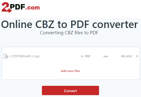 2PDF มีชุดตัวแปลงออนไลน์ และยูทิลิตี้สำหรับไฟล์ PDF คอลเลกชันนี้ประกอบด้วยตัวแปลง CBZ เป็น PDF ที่คุณสามารถใช้งานได้ฟรี นี่คือตัวแปลงอย่างง่ายที่คุณสามารถวางไฟล์ CBZ ของคุณและแปลงได้ ใช้งานได้กับไฟล์ในเครื่องเท่านั้นและไม่มีคุณสมบัตินำเข้าคลาวด์ คุณสามารถเพิ่มไฟล์ได้สูงสุด 10 ไฟล์ต่อการแปลงและแปลงพร้อมกันทั้งหมด หลังจากการแปลง คุณต้องดาวน์โหลดไฟล์ที่แปลงแล้วแยกกัน ไม่มีตัวเลือกในการดาวน์โหลดไฟล์ที่แปลงแล้วทั้งหมดในครั้งเดียว