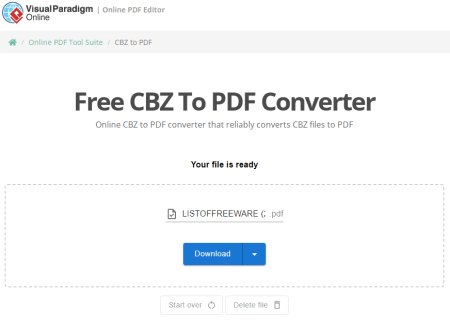 Visual-Paradigm.com เป็นเว็บไซต์ฟรีที่ให้บริการตัวแปลง CBZ เป็น PDF ออนไลน์ นี่เป็นตัวแปลงอย่างง่ายที่ใช้งานได้กับไฟล์ในเครื่องเท่านั้น มันประมวลผลทีละไฟล์ คุณสามารถอัปโหลดหรือลากและวางไฟล์ CBZ ไปยังตัวแปลง เมื่อคุณทำเช่นนั้น จะเริ่มกระบวนการแปลงโดยตรง ไม่มีตัวเลือกการแปลงที่จะกำหนดค่าที่นี่ เมื่อการแปลงเสร็จสิ้น คุณจะได้รับตัวเลือกในการดาวน์โหลดไฟล์ PDF ที่แปลงแล้ว นอกจากนั้น คุณยังได้รับตัวเลือกในการส่งออกไฟล์ที่แปลงโดยตรงไปยัง Google Drive, Dropbox หรือ OneDrive